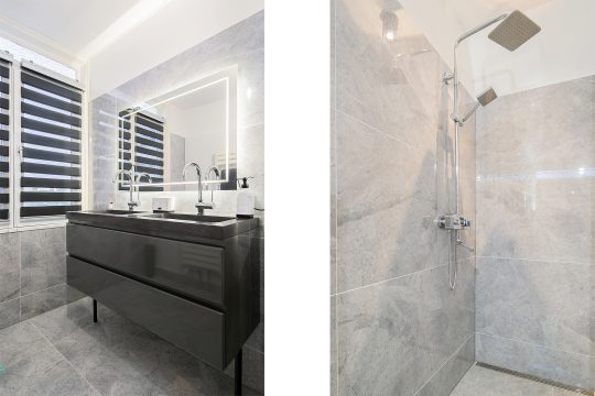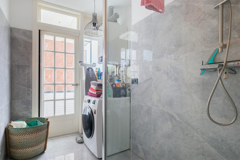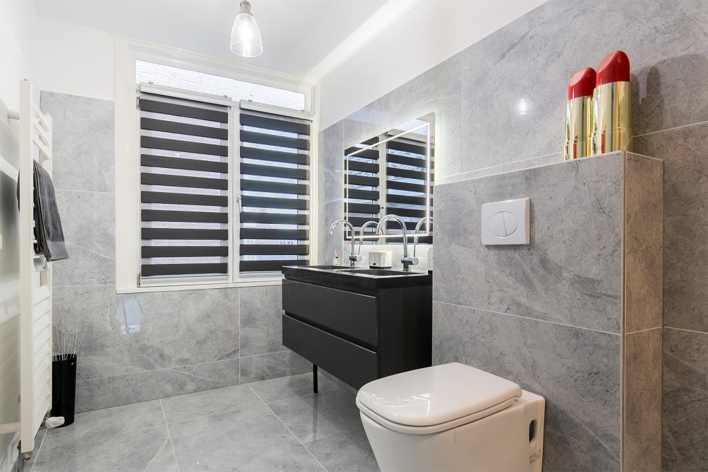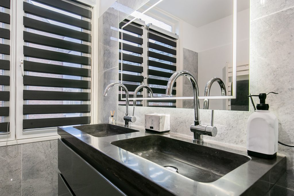 Luxe badkamer met dubbele wastafel, inloopdouche, designradiator, hangtoilet en aansluiting voor wasmachine