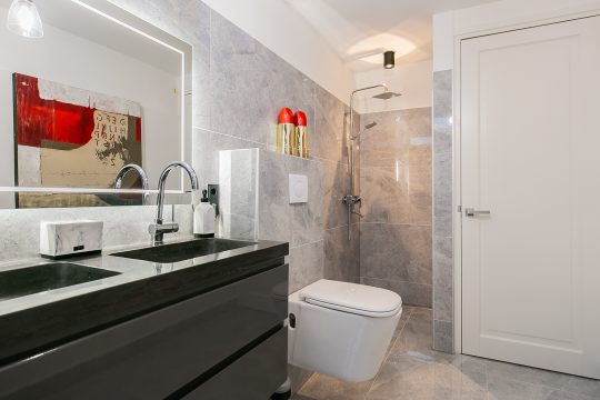 * Luxury bathroom with double sink, walk-in shower, designer radiator, wall-mounted toilet, and washing machine connection