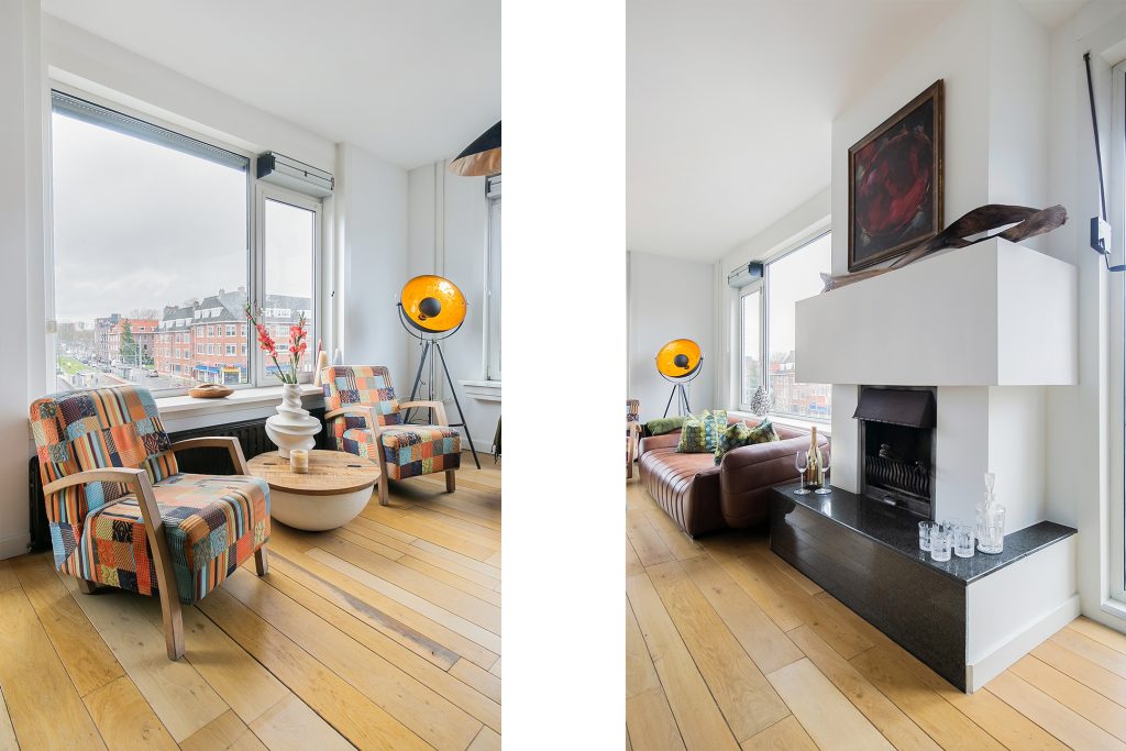 Ruime en lichte woonkamer met open haard en dubbele balkons