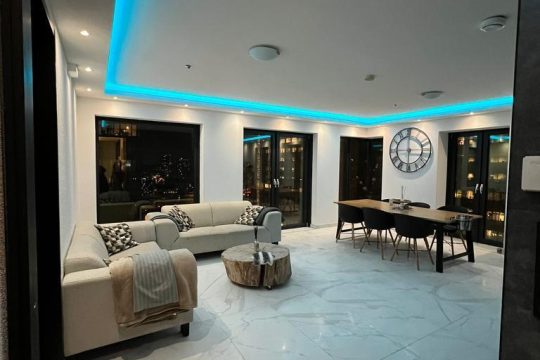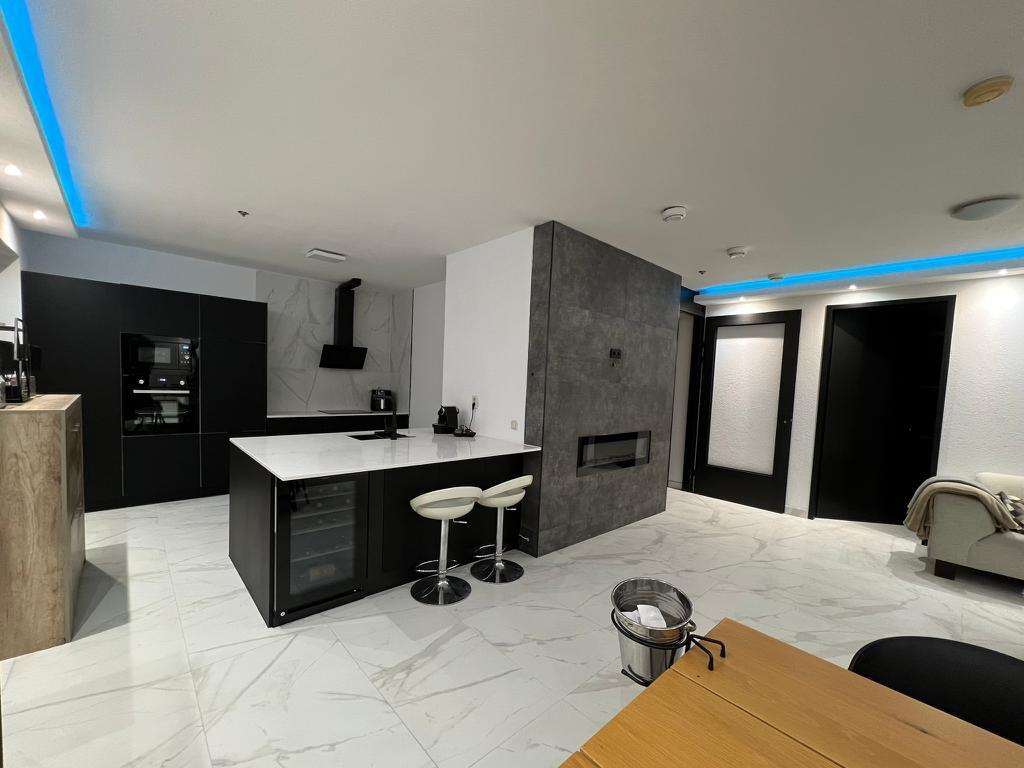 The bright living room with floor-to-ceiling windows and natural stone flooring connects to a luxurious open kitchen with breakfast bar and premium built-in appliances (including a wine cooler, combi oven, induction hob, dishwasher and fridge/freezer). The apartment further features two spacious bedrooms, a newly renovated guest toilet, and a modern bathroom with bathtub, walk-in shower, double sinks, and underfloor heating.
