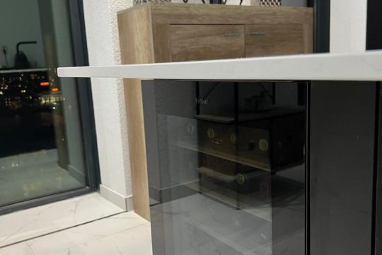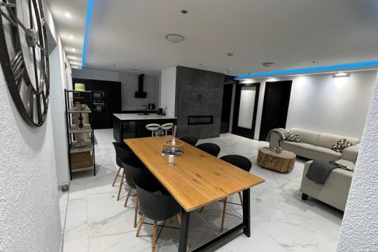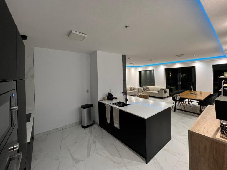 De woning beschikt over een lichte woonkamer met grote raampartijen en natuurstenen vloer, een luxe open keuken met bar en hoogwaardige inbouwapparatuur (waaronder wijnklimaatkast, combi-oven, inductiekookplaat, vaatwasser en koel-/vriescombinatie), twee ruime slaapkamers, een vernieuwd gastentoilet en een moderne badkamer met ligbad, inloopdouche, dubbele wastafel en vloerverwarming.