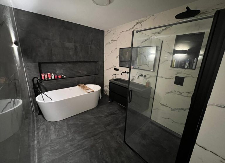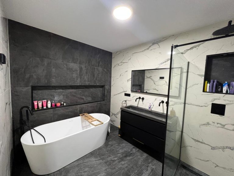 Badkamer: ligbad, inloopdouche, dubbele wastafel, vloerverwarming