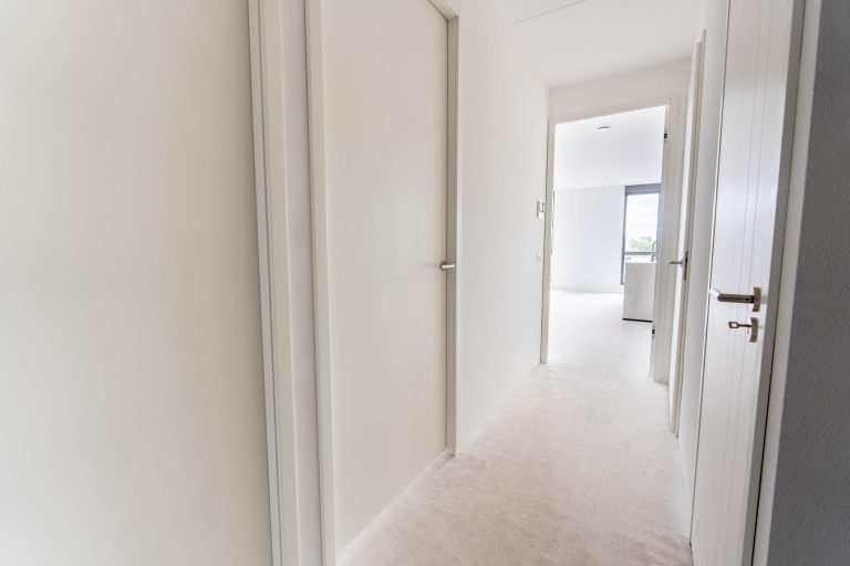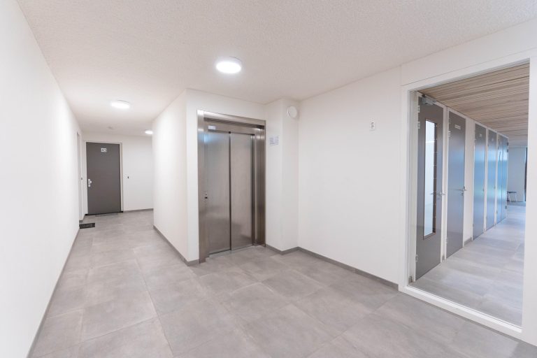 U verlaat de lift en komt in de gemeenschappelijke ruimte met toegang tot de verschillende appartementen.