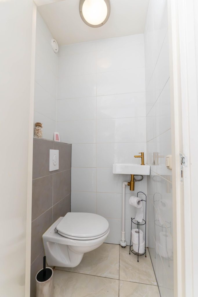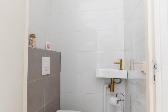 Netjes betegelde toiletruimte voorzien van een hangtoilet en een fonteintje.
