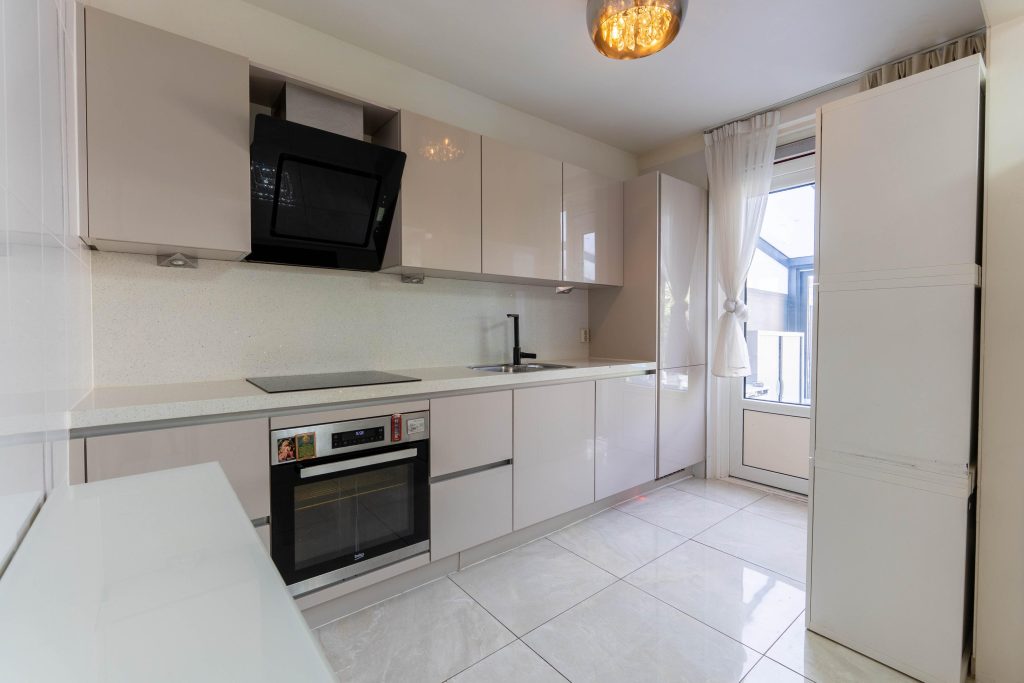 De moderne keuken staat in een rechte opstelling en is voorzien van diverse inbouwapparatuur: afzuigkap,