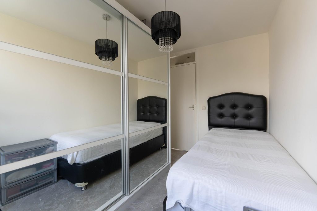 De 2e slaapkamer is ook voorzien van inbouwspots. De strakke badkamer met